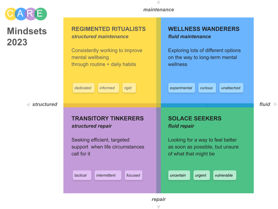 Foundational frameworks enable organizations to unify around a shared understanding of their users. Mindsets are a research-backed framework that enables organizations to create experiences that are tailored for the most common and specific mindsets rather than all users in general. I was thrilled to bring this shared understanding to Headspace through the Care Mindsets. While breaking ground as the organization’s first field researcher since before the pandemic, I surfaced deep ethnographic findings as I went to folks’ homes and discussed their mental health care journeys and experiences. Partnering with the service design team (design project lead: Trace Manuel), we created four care mindsets based on a matrix of how individuals seek care (structured or fluid) and why (for maintenance or repair) as shown in the framework visual here. These unique insights to understanding users unlocked new designs and strategic initiatives.